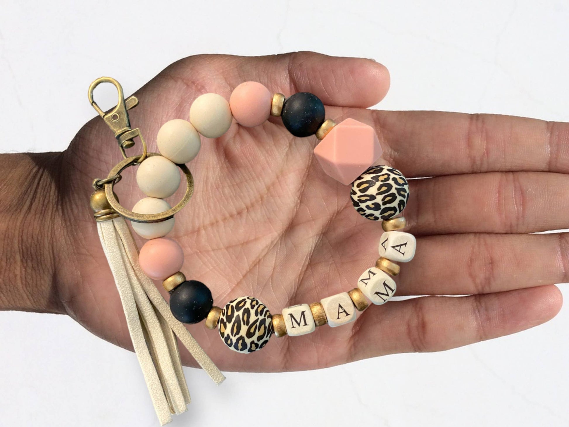Mama Beaded Wristlet Keychain/Leopard Mama Key Ring